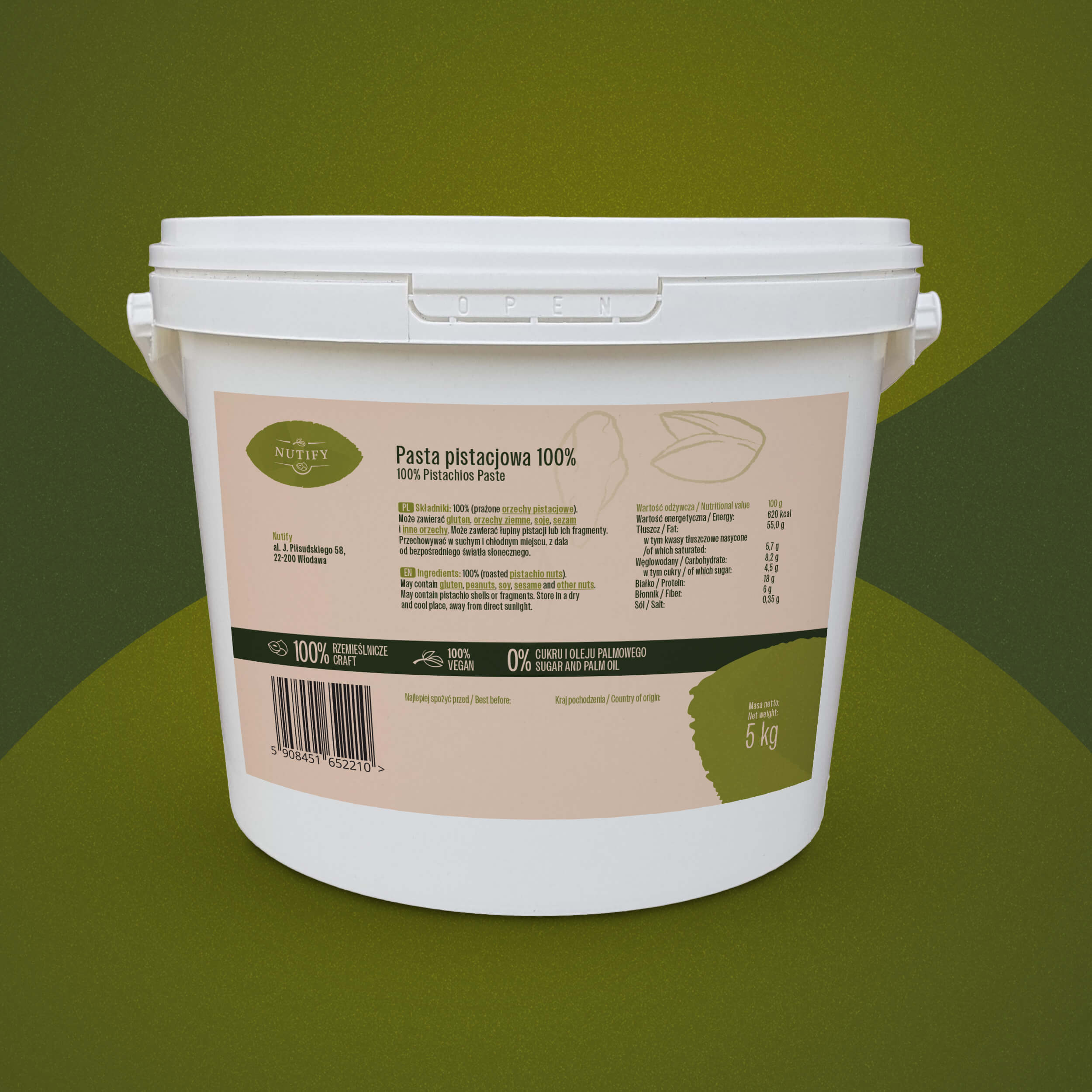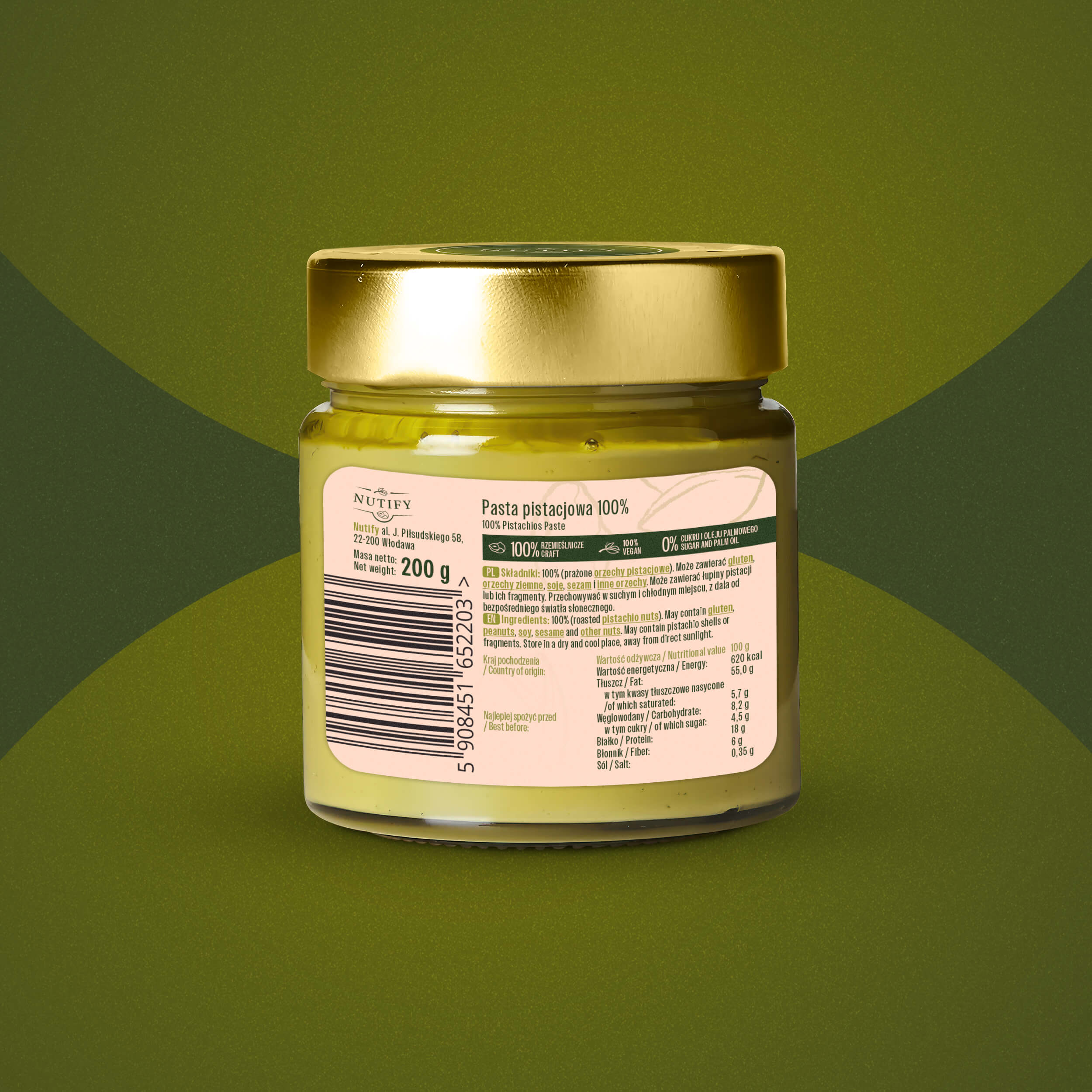 Pasta pistacjowa Nutify to intensywny smak, który zachwyca w każdej łyżeczce. Bogata, lekko słona nuta pistacji z Iranu w połączeniu z gładką teksturą to doskonały i smakowity miks dla każdego prawdziwego miłośnika pistacji. Sprawdzi się na kanapce, w smoothie, a także jako składnik wypieków i deserów – nasza pasta nie tylko smakuje, ale także jest bardzo zdrowa i nie zawiera oleju palmowego, czy sztucznych dodatków i cukru.